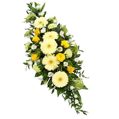 Lieflijk gele rozen, gerbera's, lisianthus, anjers en akkerscherm voegen tere kleur toe aan dit rouwstuk. Herdenk op subtiele wijze de mooie herinneringen aan je naaste met dit liefdevolle eerbetoon.