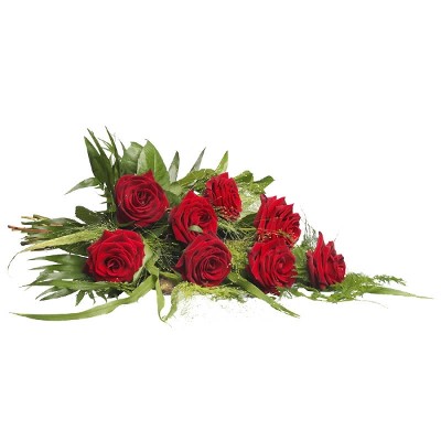 Een elegant rouwboeket met rode rozen en seizoensgroen. Handgemaakt en persoonlijk bezorgd door een van onze lokale bloemisten. De afbeelding toont de "standaard" variant. Een rouwlint kan apart worden bijgevoegd.